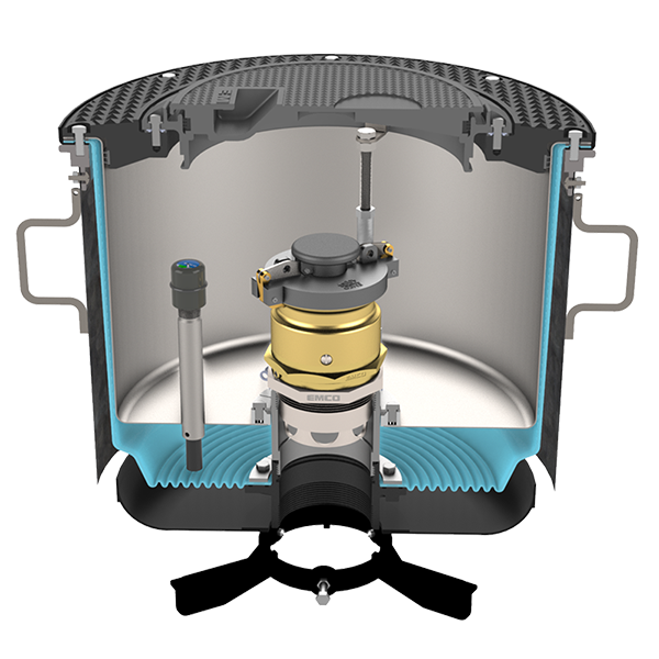 | Part | Material | Gal. | SW | DW | Overall Dia. A | Installed Ht. B | Lid Dia. | Lid Lbs. | Total Lbs. | Drain Type | Sensor |