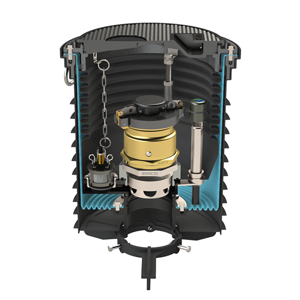 - Powder coated, water-resistant cast iron or composite lid with built-in handle, exclusive triple wiper seal and vent valve; meets AASHTO H20 wheel loading